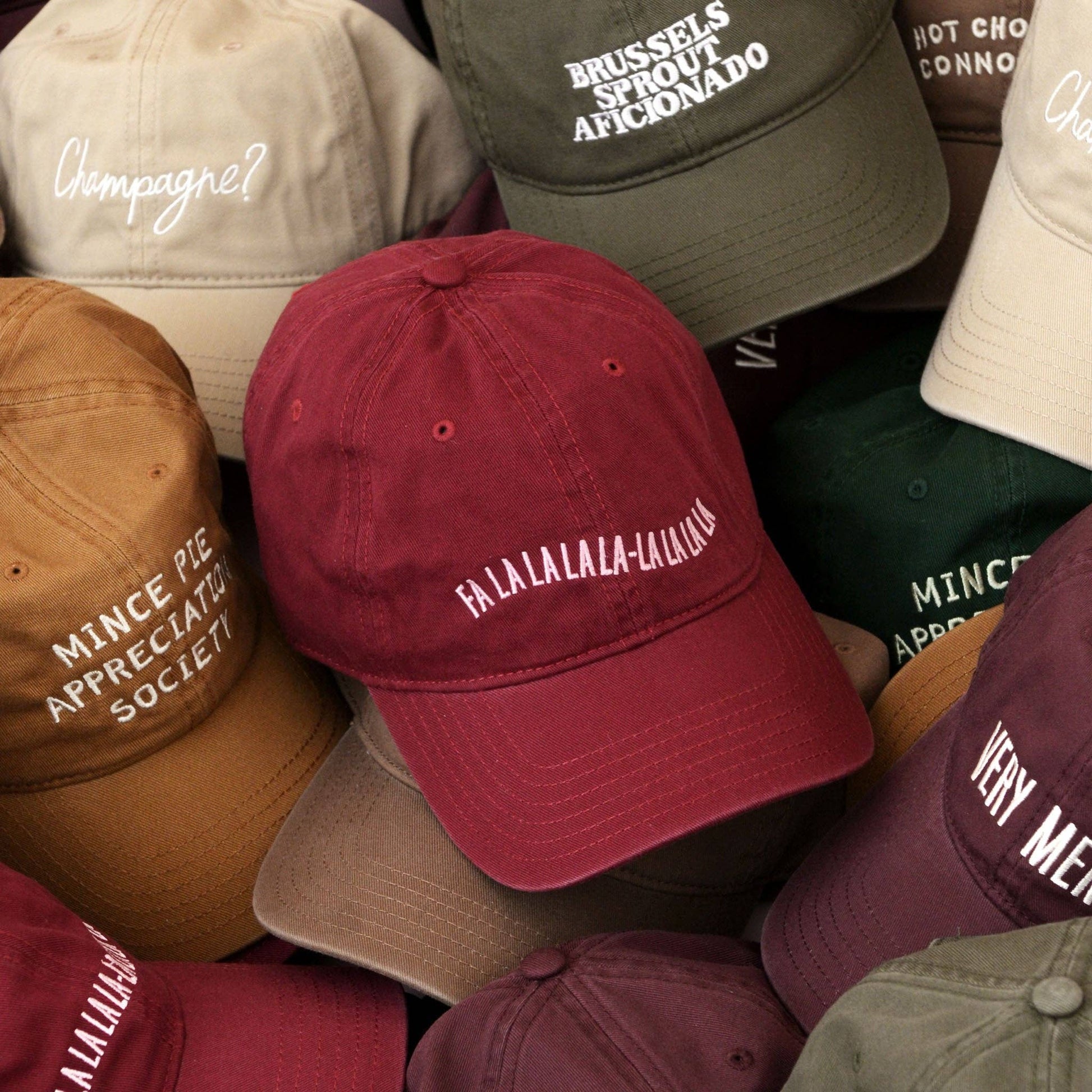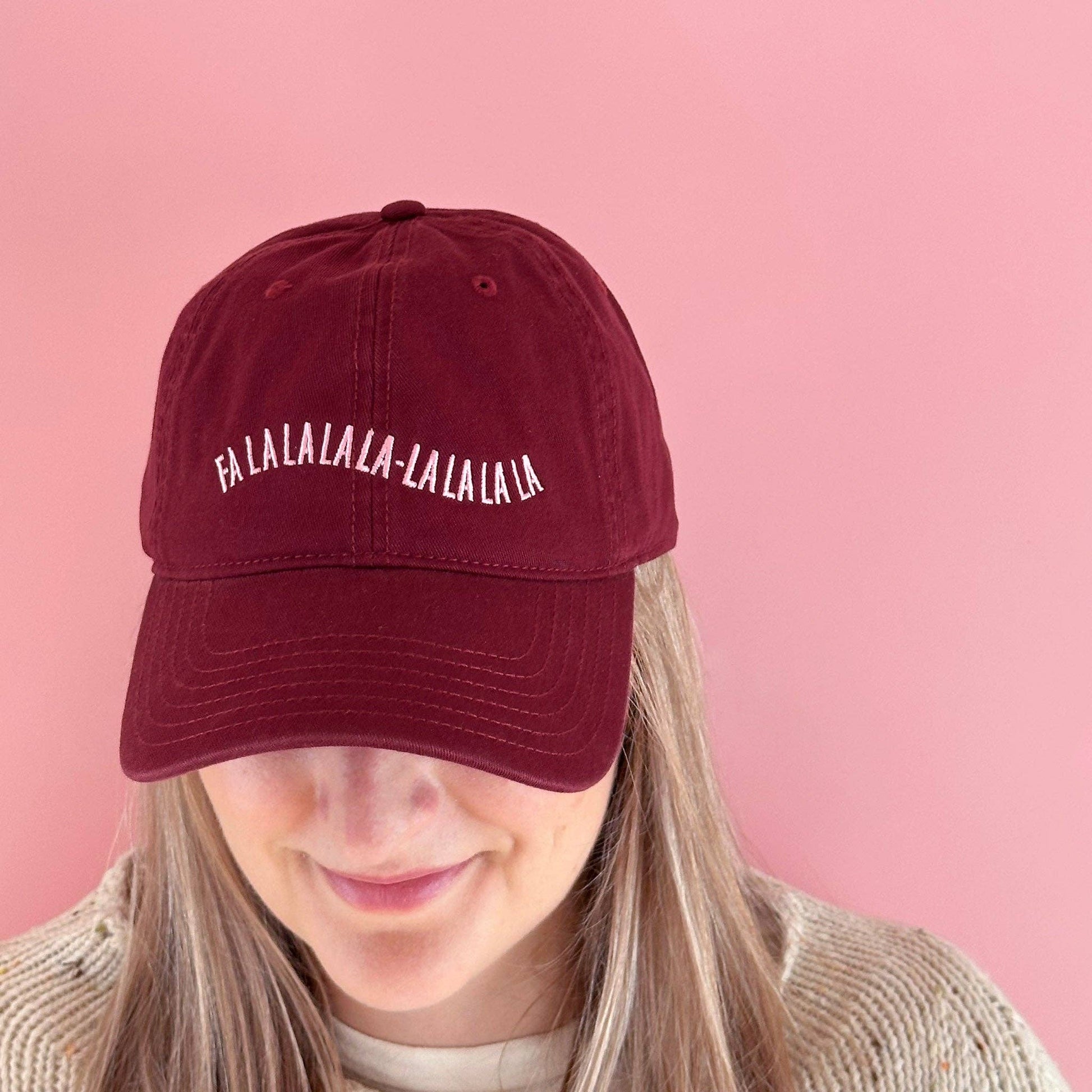 Get into the festive mood with the FALALALALA LALALALA embroidered cap! Made from soft, high-quality cotton with a relaxed, unstructured fit, this vintage-style dad hat is perfect for Christmas parties, winter walks, or just spreading holiday cheer. The pale pink embroidery on rich burgundy cotton adds a playful seasonal touch, while the adjustable strap ensures a comfortable fit. A fun and festive accessory to keep your holiday style on point!