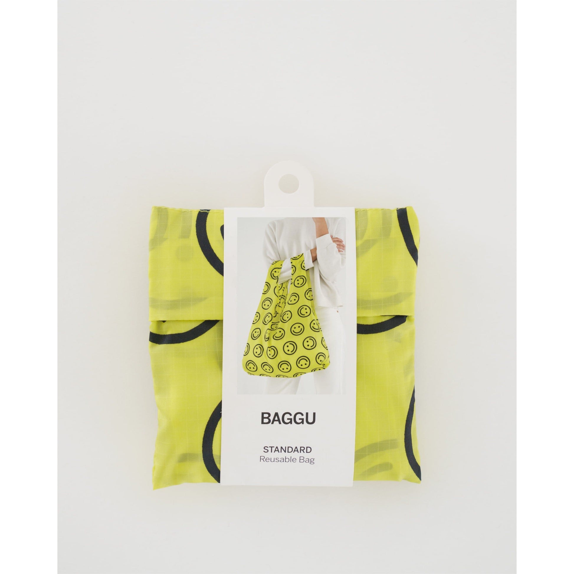 Brighten your day with the Baggu Standard Reusable Bag in Yellow Smiley Faces Print. Made from lightweight, durable recycled ripstop nylon, this bag folds compactly for easy storage and expands to carry all your essentials effortlessly.